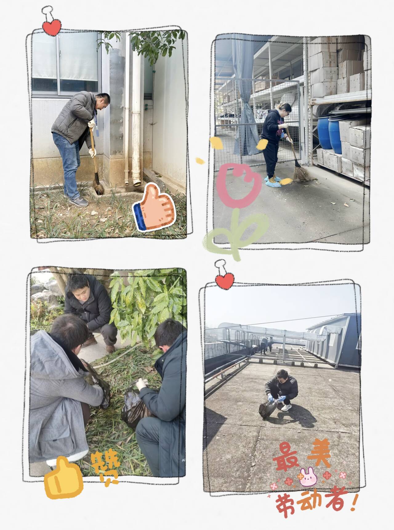 各部門同事們紛紛響應(yīng)號召,如同一股股清泉匯聚,大家秉持著不怕臟、不怕累的熱忱,以昂揚(yáng)的斗志投入打掃中。看,那在樓頂清掃的同事,宛如大樓“美容師”,專注地拂去每一絲塵埃,讓樓頂在陽光的照耀下熠熠生輝;而清理倉庫周邊雜草的同事們,正在拔除歲月滋生的雜亂,為倉庫周邊重塑整潔輪廓。在這場大掃除里,每個人都是主角,齊心協(xié)力為公司區(qū)域的每一寸土地注入清新與活力。大家在共同勞作中,深切體會到維護(hù)公司公共環(huán)境的責(zé)任之重,那份強(qiáng)烈的責(zé)任感與使命感,如同璀璨星辰,照亮了企業(yè)環(huán)境建設(shè)的前行之路。