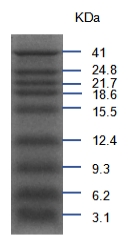 本產(chǎn)品包含了從3.1kDa到41kDa共9種蛋白質(zhì)(3.1,6.2,9.3,12.4,15.5,18.6,21.7,24.8,41 kDa)。在三羥甲基氨基甘氨酸(Tricine)-SDS-PAGE電泳過程中,用于判斷目的蛋白的分子量大小。