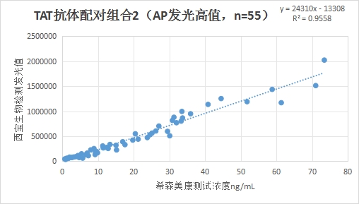 西寶TAT抗體配對組合1(<20 ng/mL)的發(fā)光值與希森美康 TAT發(fā)光試劑賦值臨床相關(guān)性R2在0.94左右。