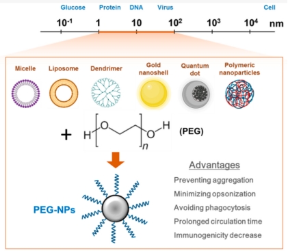 聚乙二醇(PEG)常與尺寸為 1-100 nm(與蛋白質(zhì)、病毒和 DNA 等天然納米結(jié)構(gòu)相當(dāng))的合成納米顆粒(NP)表面偶聯(lián),形成的 PEG-NP 在藥物遞送系統(tǒng)中具備諸多有利特性。