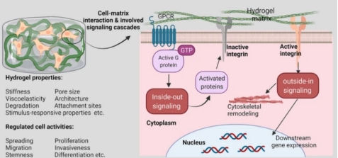 聚乙二醇(PEG)基水凝膠作為可調(diào)控的三維網(wǎng)絡(luò)結(jié)構(gòu),通過其可變的理化性質(zhì)(如交聯(lián)方式)介導(dǎo)細胞與基質(zhì)的相互作用,提供動態(tài)微環(huán)境,而化學(xué)交聯(lián)(如共價鍵)增強機械穩(wěn)定性,從而觸發(fā)信號級聯(lián),調(diào)控細胞粘附、遷移及分化等行為。