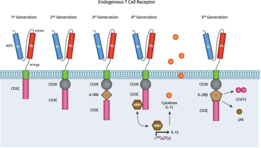 CAR結(jié)構(gòu)通常也由三部分組成,即胞外抗原結(jié)合區(qū)(一般為scFv)、跨膜結(jié)構(gòu)域以及胞內(nèi)激活結(jié)構(gòu)域。經(jīng)過多年發(fā)展,CAR結(jié)構(gòu)已經(jīng)發(fā)展至第四第五代,CAR結(jié)構(gòu)的改進主要集中在胞內(nèi)共刺激結(jié)構(gòu)域。有學(xué)者在第四代CAR-T的設(shè)計中添加細胞因子或趨化因子受體結(jié)構(gòu),從而增加T細胞在腫瘤組織中的浸潤,達到增強殺傷實體瘤的效果。第五代CAR在共刺激域(如CD28或4-1BB)和CD3ζ鏈之間,插入了IL-2Rβ等細胞因子受體的胞內(nèi)片段,當(dāng)CAR結(jié)合抗原后,該片段包含的YXXQ基序(Y代表酪氨酸)招募并激活JAK激酶和STAT蛋白,從而同時啟動T細胞活化和細胞因子驅(qū)動的增殖信號。