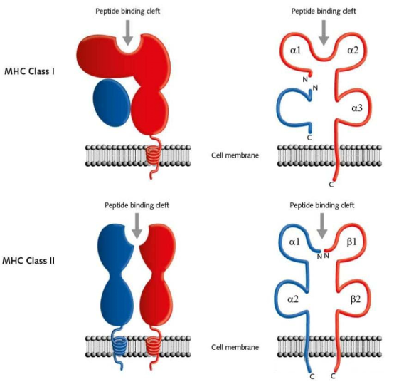 TCR-T療法依賴T細胞受體(TCR)與MHC呈遞的胞內(nèi)抗原結(jié)合識別腫瘤細胞。MHC有兩種類型MHC-I與MHC-II,由人類6號染色體短臂上的人類白細胞抗原(HLA)基因座編碼,在細胞表面不同程度表達。其中,HLA-A、HLA-B及HLA-C編碼MHC-I型分子,HLA-DR、HLA-DQ、HLA-DP編碼MHC-II型分子。MHC-I負責(zé)呈遞內(nèi)源性抗原信號分子,它在幾乎所有有核細胞表面表達,由一條α鏈和β球蛋白組成,其中α1和α2兩個結(jié)構(gòu)域構(gòu)成一個溝(Groove),這是肽段結(jié)合區(qū),其允許抗原多肽片段結(jié)合并呈遞到細胞膜表面。MHC-II負責(zé)呈遞外源性信號分子,在抗原呈遞細胞(APC)表面表達,如單核-巨噬細胞、樹突狀細胞及B細胞等。MHC-II由α和β兩條鏈組成,其中α1與β1之間形成的溝能參與抗原多肽片段的結(jié)合。