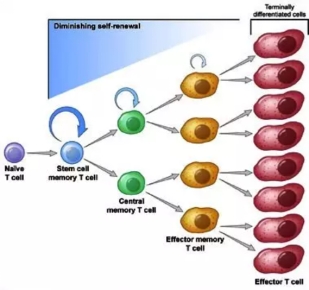 依靠IL-2的傳統(tǒng)培養(yǎng)中,激活擴增得到的T細胞中,完全分化的效應(yīng)T細胞(TEF)占比更多。在使用IL-15部分替代IL-2的培養(yǎng)中,未完全分化的記憶T細胞(Tscm)的占比較僅以IL-2的顯著的多,研究表明,T細胞亞群的選擇是CAR-T細胞治療效果的基礎(chǔ)。在這方面,中央記憶T細胞(TCM)的CAR轉(zhuǎn)導(dǎo)似乎對體內(nèi)有效的細胞擴張、存活和持久性至關(guān)重要,同樣數(shù)量細胞移植,移植Tscm的子代細胞數(shù)量較Tcm高10~100倍(Gattinoni L, Nat. Med.,2011)。此外,選擇幼稚或分化程度較低的CD8+T細胞進行轉(zhuǎn)導(dǎo)可以使輸注后T細胞增殖和體內(nèi)持久性增加。