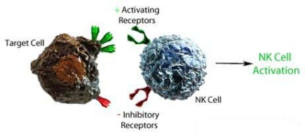 具體來講,NK細胞表面的抑制性受體(主要是抑制性殺傷性Ig樣受體KIRs和異二聚體C型凝集素受體NKG2A)可與靶細胞表面的MHC I結(jié)合并傳遞抑制信號,從而使NK細胞進入“沉默”狀態(tài);而NK細胞表面的激活性受體(主要是NCRs、NKp46、NKp30、NKp44和NKG2D)與可與細胞表面的特異性激活配體結(jié)合,從而激活NK細胞。