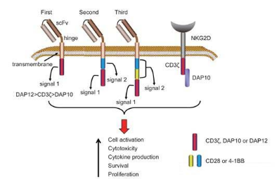 CAR-NK細胞的CAR結(jié)構(gòu)通常也由三部分組成,這與CAR-T細胞療法中使用的CAR結(jié)構(gòu)十分類似,事實上,目前的很多研究直接是把CAR-T中成熟的CAR結(jié)構(gòu)在NK細胞系中表達來制備CAR-NK。與CAR-T中常見的CAR結(jié)構(gòu)相比,CAR-NK還可以選擇NKG2D作為CAR結(jié)構(gòu)的識別結(jié)構(gòu)域,原因是腫瘤中普遍發(fā)生NKG2D的配體NKG2DL表達的上調(diào)。