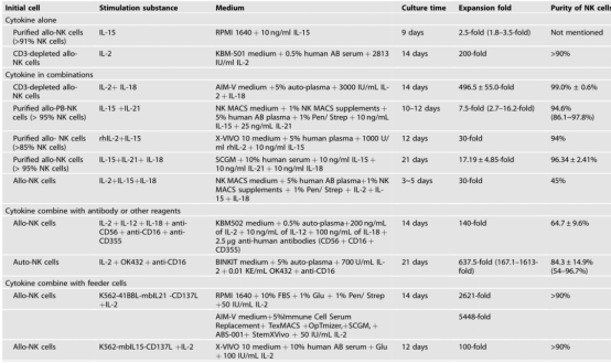細胞因子是維持NK細胞存活和支持NK細胞體外增殖的關(guān)鍵成分,可以不需要滋養(yǎng)細胞的條件下培養(yǎng)細胞。然而,當(dāng)使用不同的細胞因子和培養(yǎng)條件時,發(fā)現(xiàn)具有不同的擴增效率。