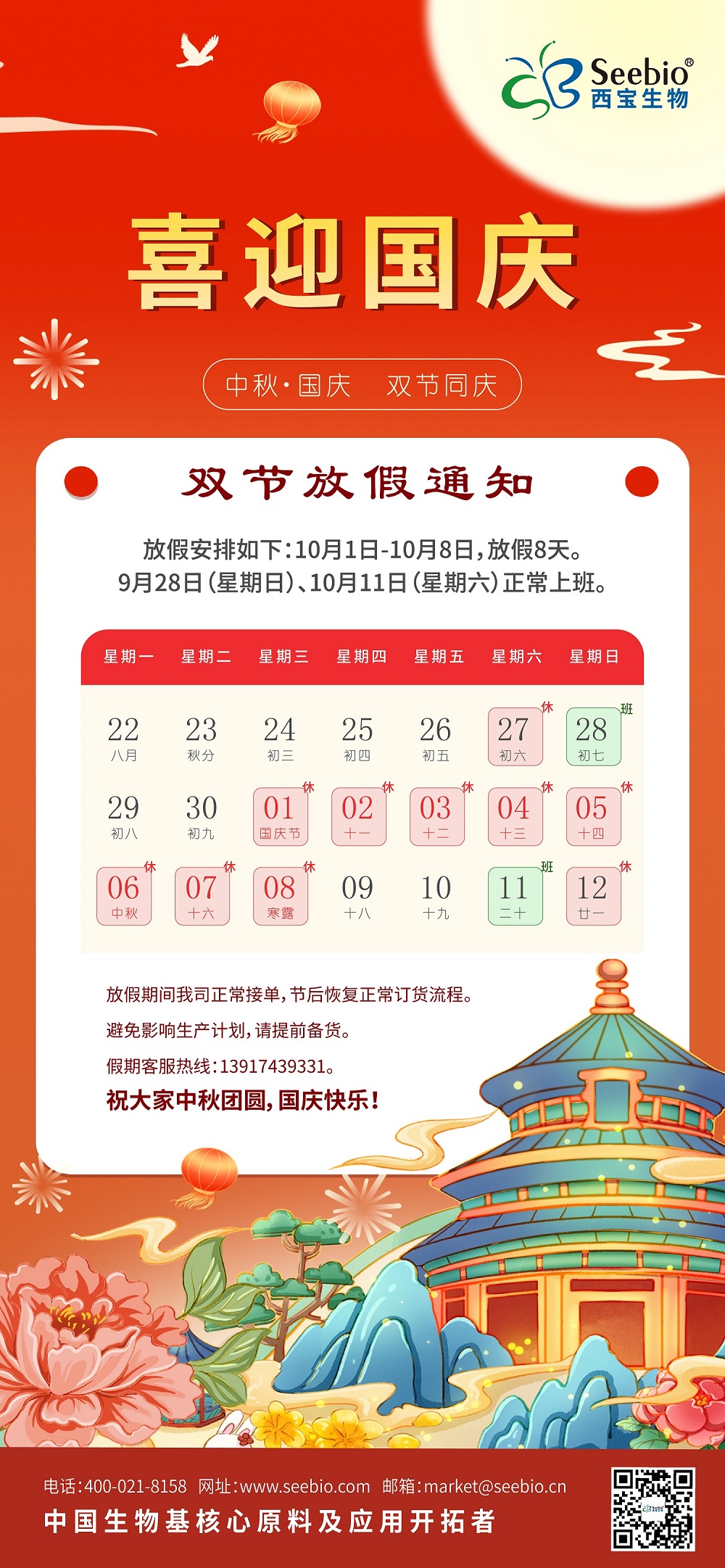 值此雙節(jié)來臨之際,西寶生物全體員工向長期支持我們的合作伙伴、客戶朋友致以最誠摯的祝福!祝愿大家在這個(gè)團(tuán)圓的節(jié)日里,闔家幸福、萬事順意,度過一個(gè)輕松愉悅的假期!節(jié)后我們將以更飽滿的熱情、更專業(yè)的服務(wù),與您繼續(xù)攜手前行,共創(chuàng)美好未來!