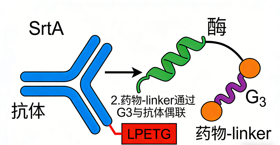分選酶A可以識別LPXTG氨基酸序列,將T-G間肽鍵斷裂形成LPXT-SrtA,含親核oligo-G的分子進入重構(gòu)形成新的肽鍵,相較于傳統(tǒng)化學(xué)偶聯(lián)的ADC藥物,藥物抗體比率(DAR)通常為0-8,導(dǎo)致療效不穩(wěn)定、毒副作用強。分選酶介導(dǎo)的連接更加精準快捷,使DAR值固定為2或4,從源頭解決異質(zhì)性問題。