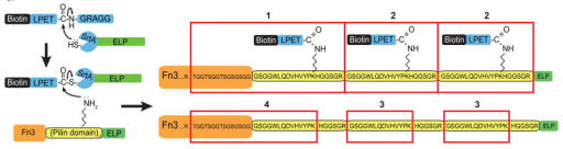 ②生物素標(biāo)記與高靈敏度檢測:有研究首次證實分選酶A的非典型異肽連接活性可用于重組蛋白修飾。實驗中,研究者用生物素修飾的LPETG肽作為底物,在分選酶A催化下,將生物素特異性偶聯(lián)到Fn3-PLN3-ELP融合蛋白的菌毛結(jié)構(gòu)域賴氨酸上,之后通過鏈霉親和素-Cy5進行免疫印跡檢測,結(jié)合SDS-PAGE和基質(zhì)輔助激光解吸電離飛行時間質(zhì)譜驗證,只有含菌毛結(jié)構(gòu)域和生物素修飾LPETG肽的反應(yīng)體系才會出現(xiàn)目標(biāo)蛋白的生物素化條帶。該方式實現(xiàn)了生物素對蛋白特定位點的精準(zhǔn)標(biāo)記,借助鏈霉親和素系統(tǒng)達(dá)成了目標(biāo)蛋白的高靈敏度鑒定?!?】