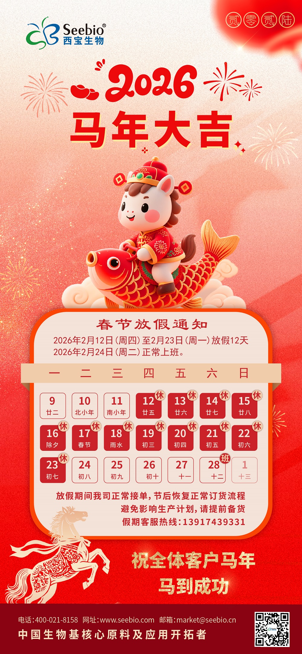 新春啟序,歲律更新?;赝^往一年,西寶生物的每一步成長,都離不開全體員工的凝心聚力與辛勤付出--是大家的堅守與拼搏,鑄就了公司發(fā)展的堅實根基;更離不開各位客戶及合作伙伴的信任與鼎力支持--是你們的認可與陪伴,賦予我們前行的無限動力。展望新的一年,西寶生物將懷揣感恩之心,攜手全體員工深耕細作,秉持匠心精進服務(wù),與各位客戶伙伴繼續(xù)并肩同行、共赴新程。衷心祝愿全體員工及各位客戶伙伴度過一個幸福祥和的春節(jié),在假期中養(yǎng)精蓄銳、舒展身心,新歲啟封,萬事順遂,大展宏圖!
