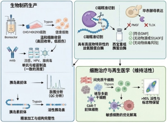 胰蛋白酶憑借 “精準(zhǔn)酶切” 與 “溫和操控” 的雙重特性,能夠完美適配不同應(yīng)用場景的嚴(yán)苛需求。