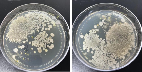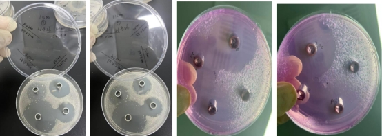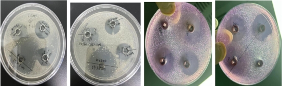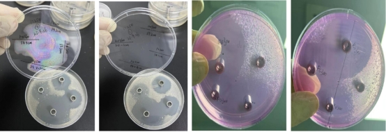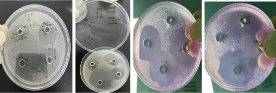2、大豆酪蛋白板,KV500 的圈大,邊緣會(huì)有些菌帶,說(shuō)明邊緣部分的抑制效果較弱。KV300 和PC300圈沒(méi)KV500 大,圈內(nèi)干凈無(wú)菌落,說(shuō)明對(duì)接種液內(nèi)的細(xì)菌都有較好的抑制效果。