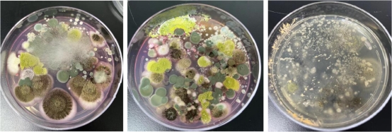 取西寶公司實(shí)驗(yàn)室、生產(chǎn)車間、倉(cāng)庫(kù)、過(guò)道的角落和設(shè)備處,用無(wú)菌棉球蘸取污物,接種到營(yíng)養(yǎng)肉湯瓊脂平板、孟加拉紅瓊脂平板、馬鈴薯葡萄糖瓊脂平板,32℃培養(yǎng)長(zhǎng)出菌落菌苔,挑取平板上易感代表性的菌落加入生理鹽水,制成混合菌接種液,接種液麥?zhǔn)蠞岫? 左右。