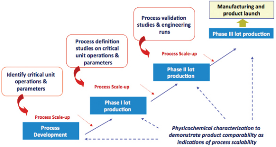 疫苗產(chǎn)品多樣且復(fù)雜,包括滅活或解毒疫苗;重組蛋白疫苗;腺病毒疫苗;及治療性疫苗等,圖1描述了原料藥疫苗工藝開發(fā)的通用方法。工藝開發(fā)從實驗室規(guī)模開始,用于確定單元操作和參數(shù),然后逐步擴大規(guī)模(通常在20L發(fā)酵或細胞培養(yǎng)下),用于生產(chǎn)用于I期臨床研究的GMP材料。在擴展到200 L(通常用于第二階段)之前,使用實驗設(shè)計(DoE)對關(guān)鍵單元操作和參數(shù)進行過程定義研究。在第三階段(約2000L規(guī)模)之前,需要進行工藝驗證和工程運行。在工藝開發(fā)和放大過程中,進行生物物理和化學(xué)表征,以證明產(chǎn)品的可比性和工藝可擴展性。
