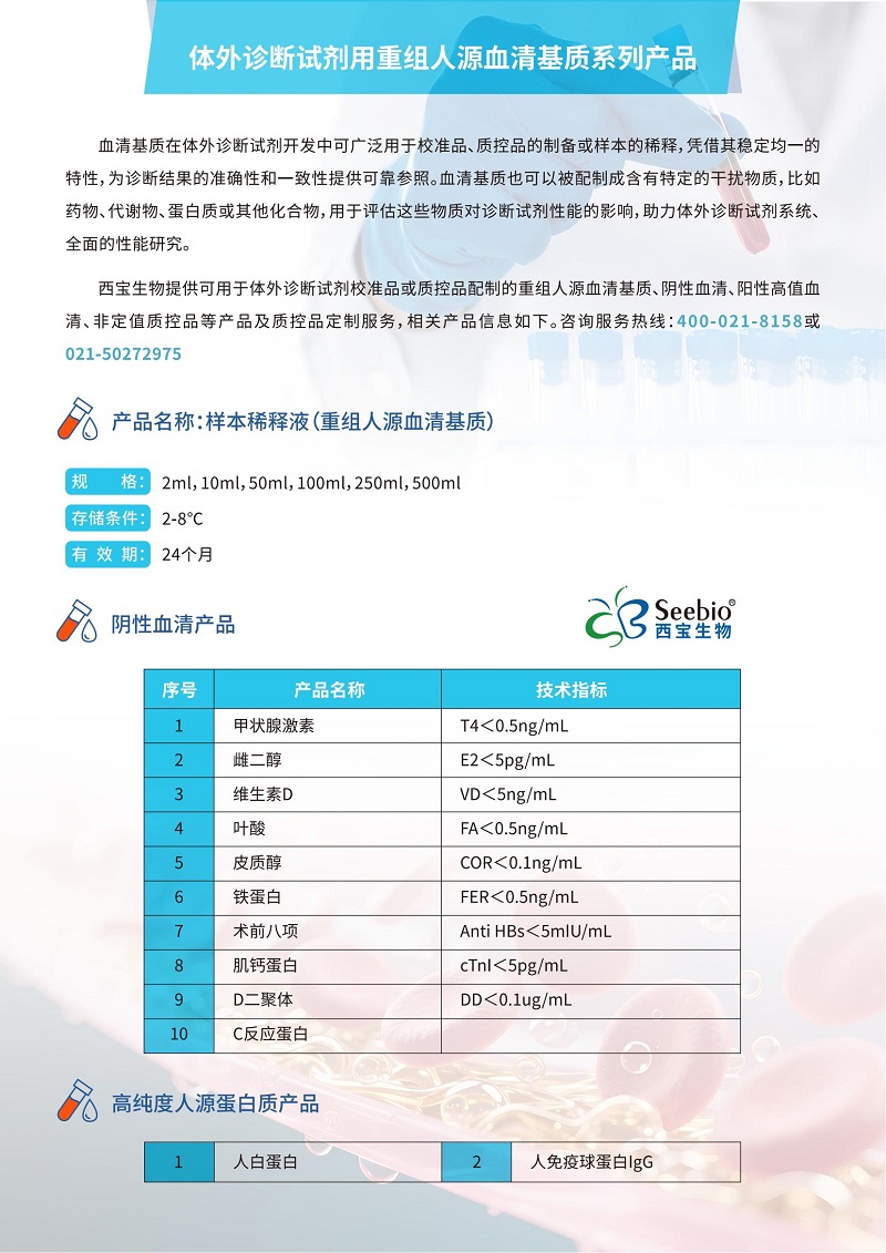 西寶生物提供可用于體外診斷試劑校準(zhǔn)品或質(zhì)控品配制的重組人源血清基質(zhì)、陰性血清、陽性高值血清、非定值質(zhì)控品等產(chǎn)品及質(zhì)控品定制服務(wù),相關(guān)產(chǎn)品信息如下。咨詢服務(wù)熱線:400-021-8158或021-50272975