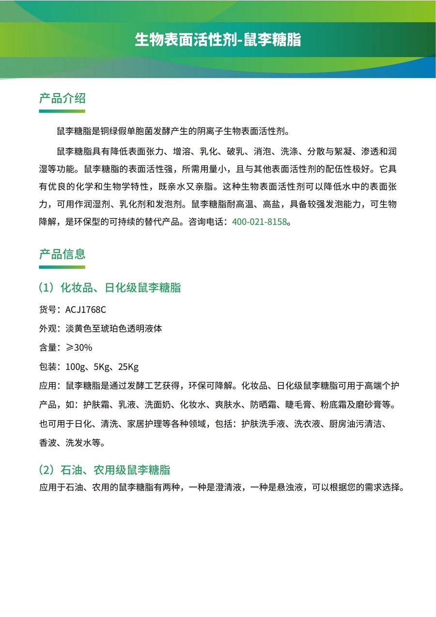 鼠李糖脂具有降低表面張力、增溶、乳化、破乳、消泡、洗滌、分散與絮凝、滲透和潤濕等功能。鼠李糖脂的表面活性強,所需用量小,且與其他表面活性劑的配伍性極好。它具有優(yōu)良的化學(xué)和生物學(xué)特性,既親水又親脂。這種生物表面活性劑可以降低水中的表面張力,可用作潤濕劑、乳化劑和發(fā)泡劑。鼠李糖脂耐高溫、高鹽,具備較強發(fā)泡能力,可生物降解,是環(huán)保型的可持續(xù)的替代產(chǎn)品。咨詢電話:400-021-8158。