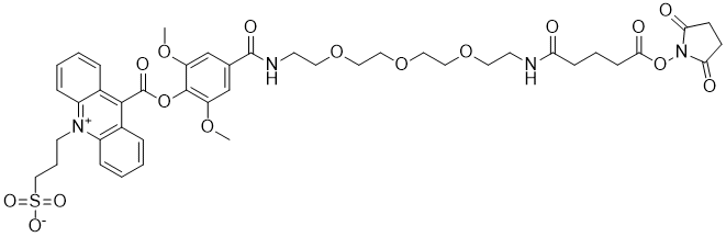 | 英文名 | 3-(9-((4-((17-((2,5-dioxopyrrolidin-1-yl)oxy)-13,17-dioxo-3,6,9-trioxa-12-azaheptadecyl)carbamoyl)-2,6-dimethoxyphenoxy)carbonyl)acridin-10-ium-10-yl)propane-1-sulfonate |