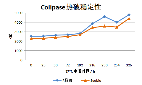 在相同脂肪酶試劑中,分別加入進(jìn)口R司品牌和Seebio品牌同樣質(zhì)量的Colipase蛋白,37℃水浴實(shí)驗(yàn)13天,進(jìn)行Colipase熱破穩(wěn)定性驗(yàn)證。
