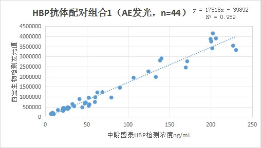 西寶生物發(fā)光(AE)平臺HBP抗體配對組合1與中翰盛泰HBP試劑(熒光免疫層析)賦值的臨床樣本相關(guān)性R2在0.95左右,相關(guān)性較好。
