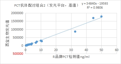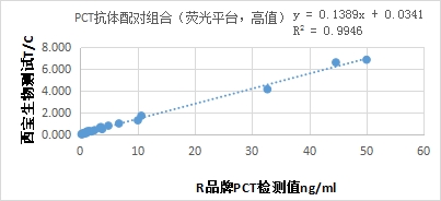 與R品牌PCT試劑臨床相關(guān)性R2>0.97,低值部分(≤10ng/ml)與R品牌PCT試劑相關(guān)性R2>0.97。