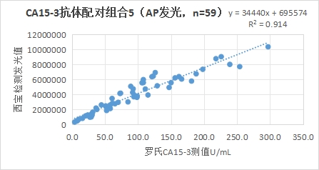 西寶CA15-3抗體配對組合5(兩試劑模式)的測試臨床樣本與羅氏 CA15-3試劑賦值的臨床樣本(相關(guān)性R2在0.91左右,相關(guān)性較好。