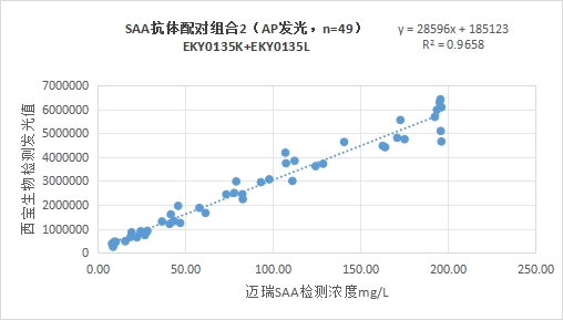 組合1:血清淀粉樣蛋白A(SAA)抗體(貨號(hào):EKY0135K)包被羧基磁珠+血清淀粉樣蛋白A(SAA)抗體(貨號(hào):EKY0135L)標(biāo)記吖啶酯;