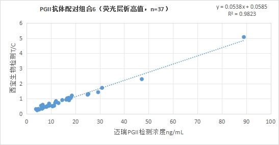 西寶生物熒光平臺PGII抗體配對組合6與邁瑞醫(yī)療PGII試劑(化學(xué)發(fā)光法)賦值的臨床樣本相關(guān)性(≤20ng/mL)R2在0.90左右,相關(guān)性較好;(<100ng/mL)R2>0.95,相關(guān)性良好。